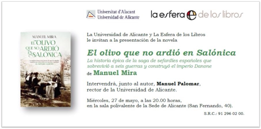 Manuel Mira Candel, Antiguo Alumno de la Promoción 61-62 del Colegio Inmaculada PP Jesuitas de Alicante presentará mañana miércoles 27 de mayo a las 20’00 horas en la sala polivalente de la Sede de Alicante (San Fernando, 40) su novela El olivo que no ardió en Salónica.